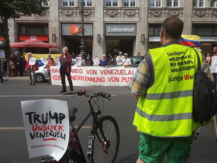 Unterschriftenaktion NO+TRUMP Brief an den UN-Generalsekretär António Guterres Venezuela vor der US-Sanktionspolitik zu beschützen Link Der Brief im Wortlaut LINK ![]() Die Kundgebung am 24.8.2019 fällt aus Infostand und Podiumsgespräch beim Sommerfest der DKP - Weberwiese, Berlin Link ![]() Sa, 17. August von 14 bis 16 Uhr Pariser Platz vor der US-Botschaft Brandenburger Tor VIDEOS HIER