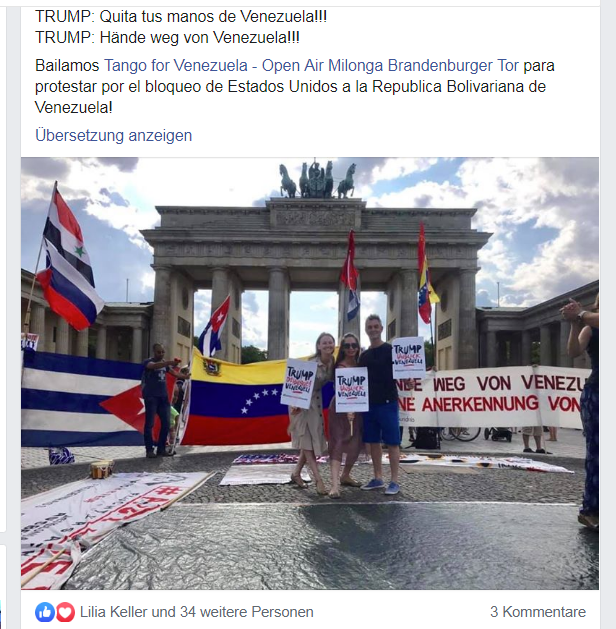 LINKOffener Brief von Dr. Volker Wirth, Berlin Zerreißprobe für Venezuela - 4 Fragen dazu an die Abgeordneten des Deutschen Bundestags: Jürgen Trittin (Bündnis 90/Die Grünen) Thomas Oppermann (SPD) Omid Nouripour (Bündnis 90/Die Grünen) Agnieszka Brugger (Bündnis 90/Die Grünen) http://haendewegvonvenezuela.net/links/offener.brief.von.dr.volker.wirth.html Kundgebung am Samstag den 3. August Brandenburger Tor / Pariser Platz Tango für Venezuela. Als Ausdruck lateinamerikanischer Kultur tanzte am 3. August die Gruppe Lilia Tango Berlin im Rahmen unserer Kundgebung vor dem Brandenburger Tor. LINK ![]() ERSTE VIDEOS UND BILDER VON DER VERANSTALTUNG AM 3. AUGUST HIER LINK Am Samstag 27. Juli fand die Kundgebung am Brandenburger Tor nicht statt sondern im Rahmen der Fiesta de Solidaridad, im Stadtpark Lichtenberg (Parkaue) LINK